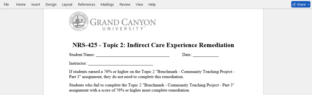 Students who fail to complete the Topic 2 “Benchmark – Community Teaching Project – Part 3” assignment with a score of 76% or higher will be required to complete a remediation plan with their faculty, using the “Topic 2: Indirect Care Experience Remediation” form, and submit the plan in addition to the necessary remediation activities by the end of Topic 3. Students who must remediate but fail to do so will not receive a passing grade in the course.