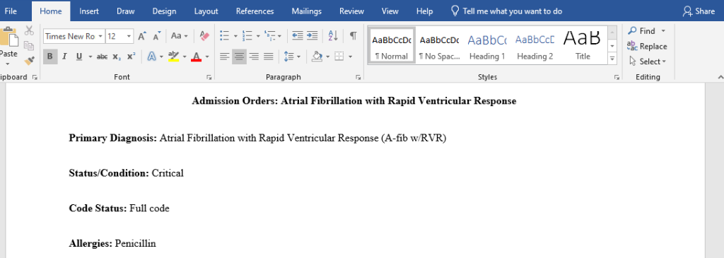 a Branching Exercise found in the Learning Resources of the weekly syllabus. For this exercise, you will be given some data and then make a choice about the finding. Depending on your choices, you will define your “patient”. The assignment asks you to write a full set of admission orders for your patient—the admission orders template is found in the Learning Resources for this week also. A reminder—this is NOT a paper—write the orders as you would enter them in the chart.