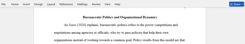 Discuss how Bureaucratic politics and organizational dynamics can negatively impact analysis and decision-making. In this discussion I am looking for your personal definition of these two key terms “bureaucratic politics” and “organizational dynamics” to start the discussion. Provide references to the literature to help back up your definition. Then look at an event from history or that is evolving today that can impact analysis negatively. An example might be the influence of the Vice President on the reports supporting confirmed WMD in Iraq. Several reports/articles/analysis published in the last few years indicate that there was bureaucratic politics involved.