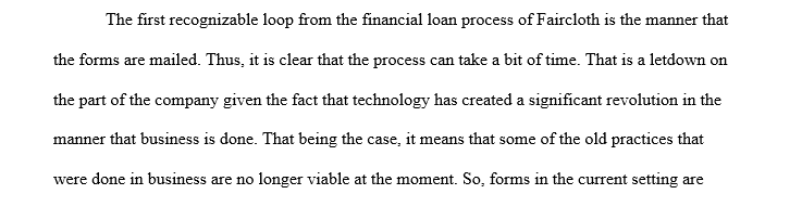 From Chapter 4, Section 4.2, Problem 2, read the current home equity loan process at Faircloth Financial and map the current process. Identify any rework loops and delays in the process. What causes these? What is the impact on cycle times? How might this affect customers’ willingness to do business with Faircloth? What changes might you recommend to redesign this process with the needs of the customer in mind? Respond to at least two of your classmates’ postings.