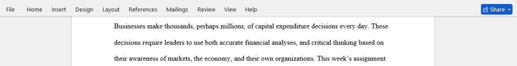 Thousands, perhaps millions, of Capital expenditure decisions are made by businesses every day. These decisions require leaders to use both accurate financial analyses, and critical thinking based on their awareness of markets, the economy, and their own organizations. This week’s assignment will place you in one of these exciting scenarios.