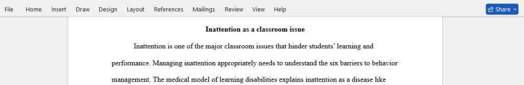 Assignment Details: Identify a Challenging classroom behavior such as inattention, poor homework completion, or verbal distractions. Use scholarly resources to describe how each of the 6 impediments to managing behavior listed in chapter 2 of your text (medical model, challenging behaviors, concept of control, personal standards/social behavior, contextual variation, and cultural diversity/ethnicity) could result in ineffective management of the challenging behavior.