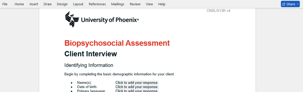 “Biopsychosocial Assessment Overview”: In this video, University of Phoenix faculty member, Hayden Center will review the form and demonstrate how to complete it.