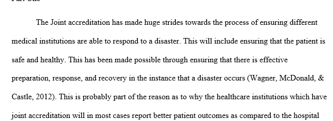 Through accreditation the Joint Commission accreditation, organizations have been able to engage in the development and implementation of comprehensive emergency management plans (Wagner, McDonald, & Castle, 2012). However, while there have been gains in quality measures including patient safety and physical restraint use, being compliant to the Joint Commission is not enough to engage in effective preparation, response, and recovery in case disaster strikes. Lam et al. (2018) found that even though Joint Commission hospitals display better results in patient outcomes, the difference with non-JC accredited hospitals is negligible which might be a consequence of competition within local and regional markets which characterizes hospitals. Wagner, McDonald, and Castle (2012) point out that the Joint Commission’s frequent assessments dull the process of emergency management and lessen its impact. Increasing competition and establishing incentives for risk management can contribute to disaster response management too.
