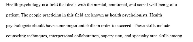 In 2,000-2,500-words, describe the attributes needed to become a competent health psychologist. Consider including information on counseling techniques, necessary personal characteristics, professional ethics, knowledge of health care and treatment methods, etc. Your answers should show an understanding of the future of health psychology.