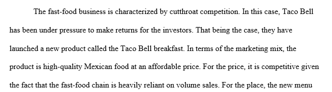4.Taco Bell’s next growth strategy might very well be to offer breakfast at its restaurants.Describe the marketing mix for this new offering.Which of the “four P’s” do you feel will be the most significant factor in the success of this offering?Explain your answer.