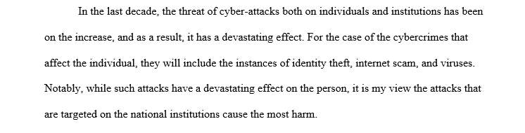 Using the articles you have read for this module, write a 500-word essay on what you believe to be the greater threat to the nation—cyber-crime directed against individuals or terrorist cyber-attacks on national institutions. Provide your opinion, supported by readings, on whether the United States is active enough in countering these threats.