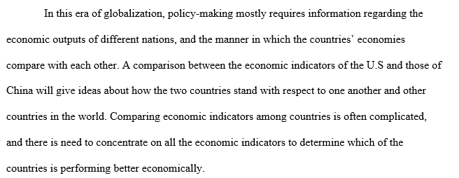 The purpose of this assignment is to investigate and to gauge your understanding of key economic indicators by filling out the figure one (1) below and to write up your findings and compare and contrast the United States to that of China.