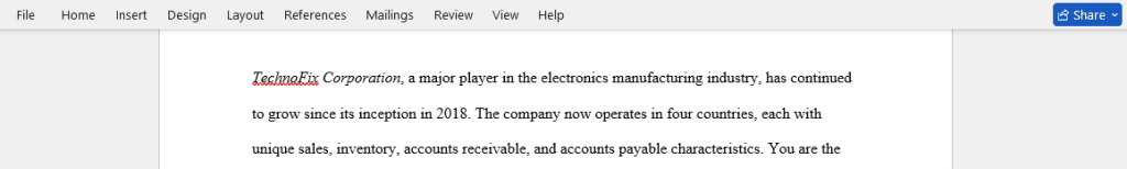 TechnoFix Corporation, now a major player in the Electronics manufacturing industry, has continued to grow since its inception in 2018. The company now operates in four countries, each with unique sales, inventory, accounts receivable, and accounts payable characteristics. You are the CFO of TechnoFix and are eager to improve the company\\\\\\\’s working capital efficiency to ensure sustainable growth and stability.