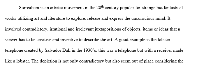 For this week’s discussion, we get to watch a fantastic video on Salvador Dali, famed Surrealist and eccentric! This video is a crowd pleaser and sure to keep you entertained! Before you view the link, make sure to preview the questions below- it may be helpful to take notes as you watch the video.