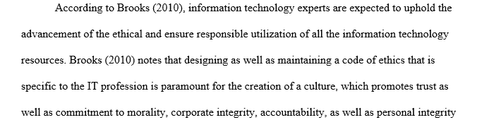 Review this paper, then in your ePortfolio summarize what should be in the code of ethics for information technology. Describe the code of ethics for information technology in your company. What should it be if it does not exist in your company? Share your summary and your company’s code of ethics in Discussions.