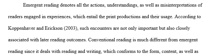 Explain why emergent reading is different than conventional reading. What can you expect in preschool regarding the progression of emergent reading? As a teacher, how can you assist in making sure this happens with young children?