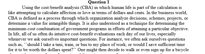 1) How do you feel about the use of cost/benefit analysis where human life is part of the