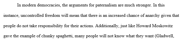 Watch the TED Talk by Malcolm Gladwell, “Choice, Happiness, & Spaghetti Sauce.” and then thank of it in the context of Blackburn’s discussion of Freedom vs Paternalism (see attachment). An interesting thing is that it took an expert to discover that many of us ‘deep in our hearts’ actually desired chunky spaghetti sauce. So, here’s the question: in modern democracies, like the U.S., is there a place for Paternalism in Government? Are there times when we’re all better off when our liberty is limited OR is the argument for Freedom the stronger – are we better, even when making mistakes, if we’re Free? If you take the position for Paternalism, be sure to discuss the risks and the reason that we have historically been moving away from Paternalism (in Government, Medicine, University Courses of Study, etc…). If you take the side of Freedom, then be sure to discuss how we’re to address our well-research and clearly demonstrated tendencies towards irrational behavior.