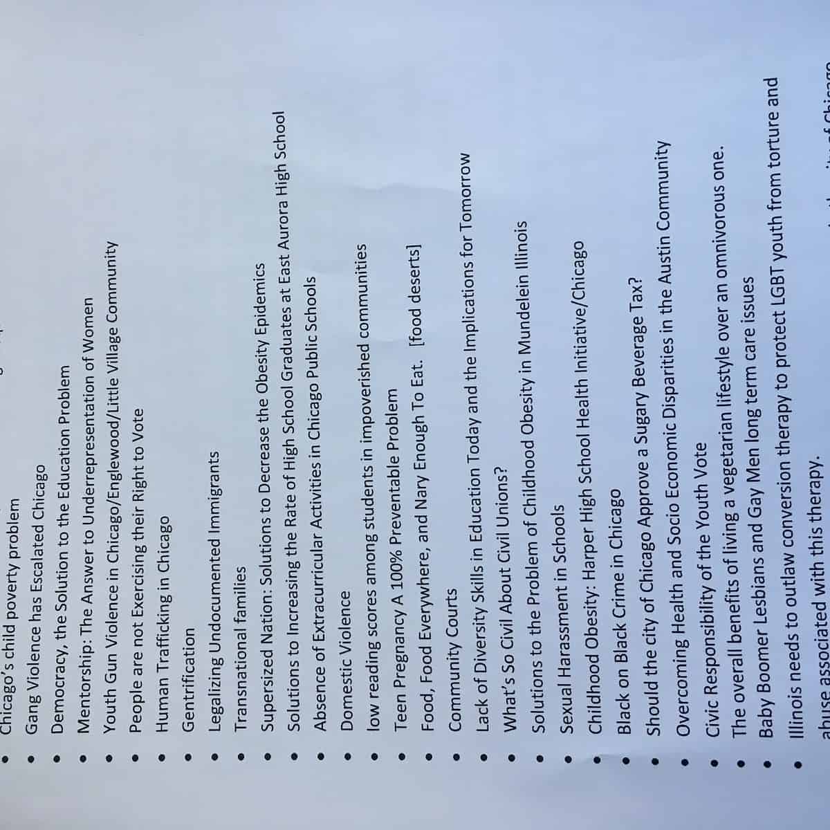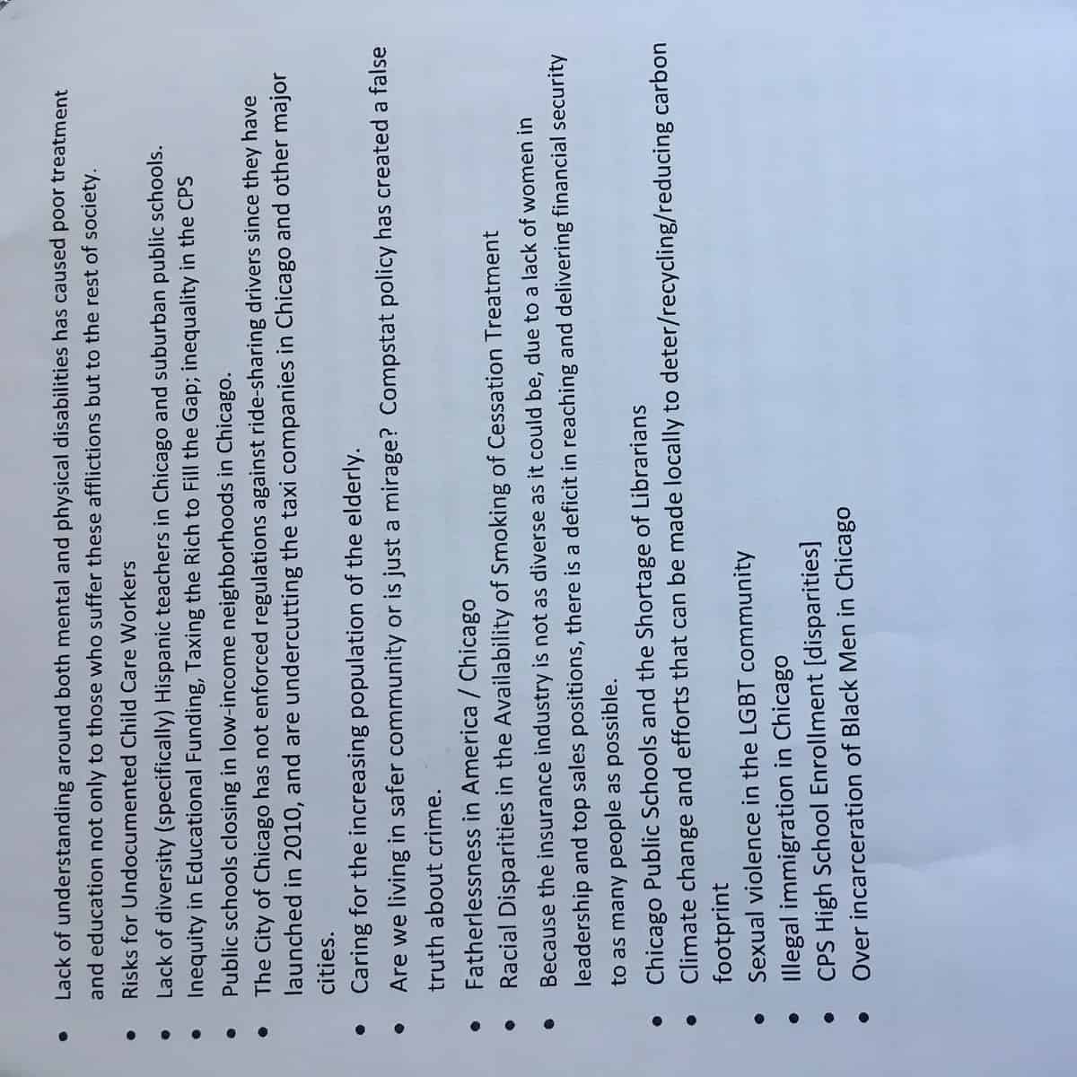 Narrow the focus of the problem by analyzing a specific group affected by the problem, a specific demographic, and/or location. You must narrow your focus to a local level since you will address a local audience in your essay (the city of Chicago, a suburb of Chicago, a specific neighborhood of Chicago such as Englewood, Logan Square, Lincoln Park or a specific workplace or school in the Chicago area).