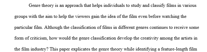 Your paper should be organized around a thesis statement that focuses on how your chosen feature-length film both aligns with and expands upon your chosen genre. Review the Week Two sample paper, which provides an example of a well-developed analysis as well as insight on composition.