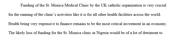 St. Monica’s Health Clinic is located in Yakoko, Northern Nigeria. The clinical leader of St. Monica discusses the objectives of the clinic and the importance of the clinic within the community. Note the emphasis on maternal child health in the video (Links to an external site.)Links to an external site.. What are the implications of the clinic potentially losing its funding?