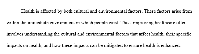 In your response, write a post that evaluates whether or not the classmate considered culture and environment in their proposed intervention. If so, is their analysis or interpretation correct? Regardless of your classmates post, what cultural and environmental factors should be considered to make improvements on the health issue discussed in the policy brief? Will the proposed intervention show improvement in local cultural / environmental factors or will it likely do more harm? Provide some data or scholarly references to support your position.