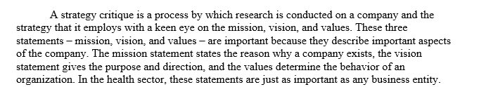 Select a leading company from healthcare industry and research its vision, mission, and values. Use any applicable materials to analyze these important direction-setting statements. Complete a 3-5-page paper. Be sure to cite your sources APA.