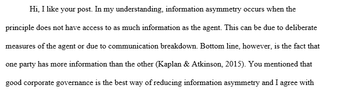 Although there are several ways to eliminate information asymmetry, I think that one of the most effective systems is good corporate governance. A corporation should include a responsible, accountable, fair, and transparent corporate structure. (BC Virtual Course Slide Template, pg. 34) My reasoning for choosing this system is because it can potentially prevent an issue before it is too late, such as avoiding years of financial misstatements, et cetera. I have learned that although there are internal accounting and auditing departments, it is mandatory that corporations hire external auditors to audit the financial statements before presenting them to the shareholders.