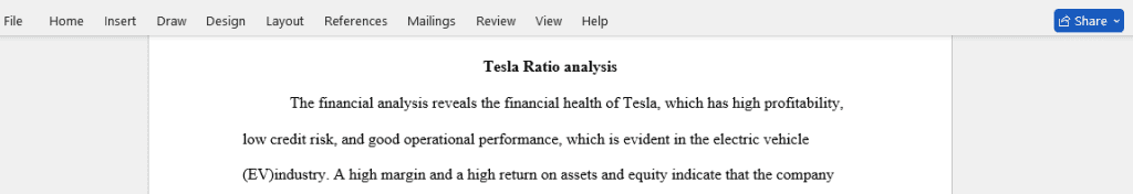 For this assignment, it is expected that you show your work in calculating ratios – the data for which can be found in Tesla’s most recent annual 10-K report.Links to an external site. There are other ways you can locate most of the ratios and industry comparison data by using free financial websites such as: