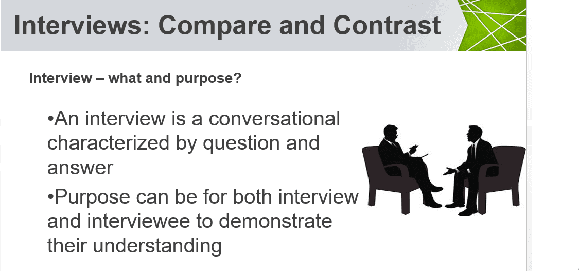 A powerpoint comparing and contrasting two different interview types. I have attached the rubric and the terms. 1-7 concerns the type of powerpoint. It needs to last 5-7 minutes.