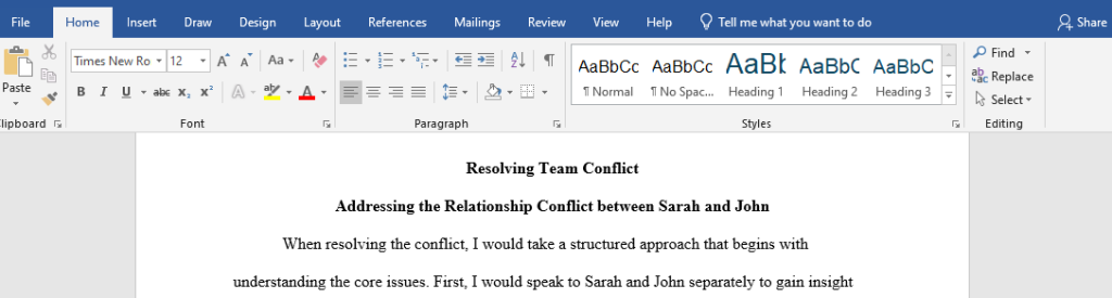 Scenario: You are the manager of a team in a mid-sized marketing firm, and two of your subordinates, Sarah and John, have been experiencing increasing tension in their working relationship. This conflict has been affecting their communication, collaboration, and the overall team dynamic. Both are valuable employees, with Sarah leading creative strategy and John overseeing client relations.