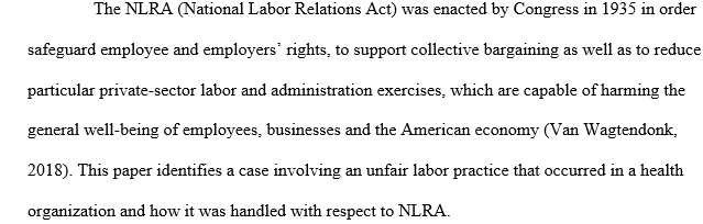 •The National Labor Relations Act (NLRA) is one of the most significant pieces of federal legislation dealing with labor relations. The Act is generally known as the Wagner Act, after Senator Robert R. Wagner of New York. Go to Findlaw.com and identify a case where an unfair labor practice occurred in a health care organization. Summarize the case law findings.