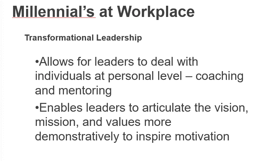 Your company’s Vice President of Human Resources has approached your team for assistance in recruiting and developing your organization’s future leaders. 60% of your company consists of millennials and your team has been charged with how to successfully increase the number of millennials as leaders in your organization. At this time, senior management is reluctant and disinterested in promoting the millennials to leadership roles. Your team created your plan in Week 2 -Part I of this assignment. Now, you are expected to develop a presentation for your senior leadership that will motivate them to encourage millennials as leaders in your organization.