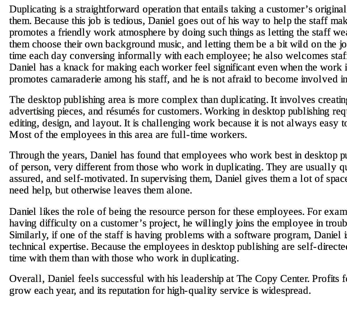 The Copy Center has two main functions/tasks with two types of employees performing those tasks. The part-time staff works in the duplicating area. The tasks are very straightforward and tedious, and the staff can become bored and unsatisfied. Because of this, Daniel demonstrates supportive leadership behavior. He allows his staff to dress casually, he converse with them informally, and allows them to be a bit wild. The second group of staff members are employed full-time and work in the desktop publishing area. The tasks in this area are more complex and require certain skills. The full-time staffers have high expectations for themselves as well as the work they produce. Daniel demonstrates an achievement oriented leadership with this group. He gives them space to allow creativity but is always available when they need help.