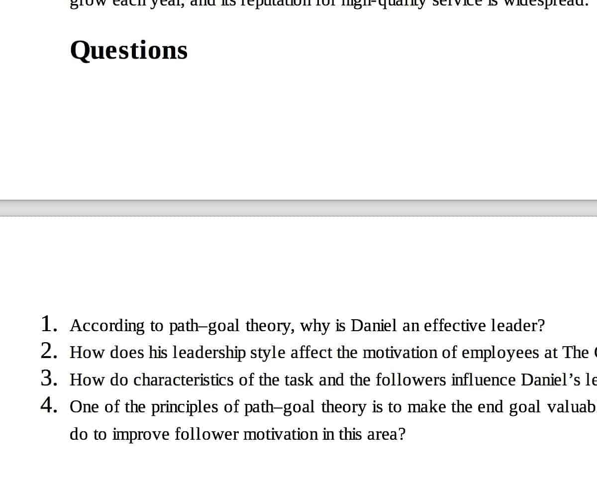 One objective of the path-goal theory is to use a leadership style that best meets the motivational needs of the follower. To do this, the leader must complement or supplement what is missing in the work setting (Northouse, 2016). Daniel caters his leadership style to what motivates each group of employees. He recognizes that his part-time staff is comprised of mostly students and require a more flexible schedule. He is very understanding to schedule conflicts and works around them the best he can. He also understands that their job duties are mundane. To counter this, he created a work environment that is laid back and fun. Daniel recognizes that his full-time employees are motived in a different manner. They are self-starters and self-motivators, so they need little attention. They are independently creative, so Daniel only intervenes when asked.