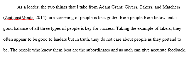 1. VIDEOS: As a leader what are 2 things you can take away from Adam Grant: Givers, Takers, and Matchers an how as a leader how can you apply this learning either at home, work, school, or in your community?