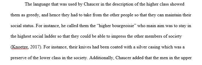 Provide examples of language or word choice (diction) that indicate the social status of the various characters of the story. Does Chaucer make characters of higher social class more or less noble of spirit? Give specific examples from the story to prove your points.