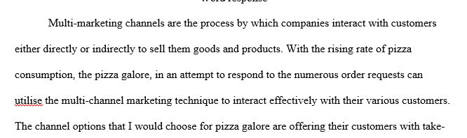Please you must watch these three clips about marketing channels. After listening to the professor’s perspective on multi-channels… what choices would you choose for Pizza Galore. How would you avoid conflict among the channels? Please write a 150-200 word response.