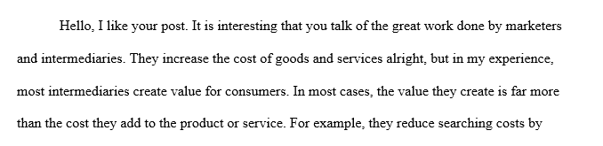 Some argue that the addition of marketing channels/intermediaries simply adds costs…..basically it inflates the prices consumers pay for goods and services.  It is worth noting that the prices one pays for goods could be marked up by 50%+ because of all the intermediaries touching the goods and moving them along the chain of distribution.   So b/c of the intermediaries that are involved, that watch you paid $500 for maybe would have only cost you $200.  Given this, in your opinion is it really worth businesses using intermediaries?