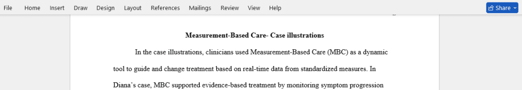 For this week\’s discussion post, please reflect on the ways that the clinicians use MBC in the case examples. Discuss ways that MBC supported treatment, barriers to using MBC in these examples, and any specific strategies the clinicians utilized to integrate MBC into their work with the cilent(s). Also, please reflect on how you might apply MBC in your current tor future work settings.