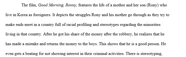 [In thinking about this particular short film, please also consider other films we have discussed, Banga Banga, Punch and The Container as a comparative background. But your essay should be on Good Morning, Ronny, if you wish or need to, with short references to these other films for comparison. However, comparison is not required and it is only optional. Please consider how this film revises certain problematic aspects of South Korean mainstream representations of the immigrant/migrant population.]