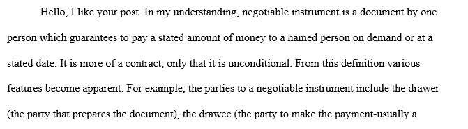 The negotiable instrument is a written paper document (commercial paper) that is signed, and the writing is the unconditional promise to pay a specific amount of money. The document can be presented in different forms, and each has different procedures. The first instrument is a draft and check that involves three parties: the creator who is called the drawer, the bank, who is the drawee and the payee who is the recipient of the money. The other negotiable instrument is a Promissory Note and Certificates of Deposit. The promissory note involves two parties which are the Promisor and the Promisee.