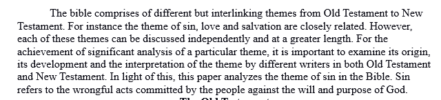Choose just one of the themes from the list below. Note developments of that theme in the Old Testament to the New Testament (N.T.), and show how N.T. writers reinterpreted it. Discuss similarities, differences, and changes to the meaning. You must provide a separate outline to your paper. Use only the following resource that’s available as an e-Book: The Oxford Encyclopedia of the Bible and Theology. Be sure to distinguish between paraphrase and direct quotes. Type a 350-750 word paper using MLA formatting.