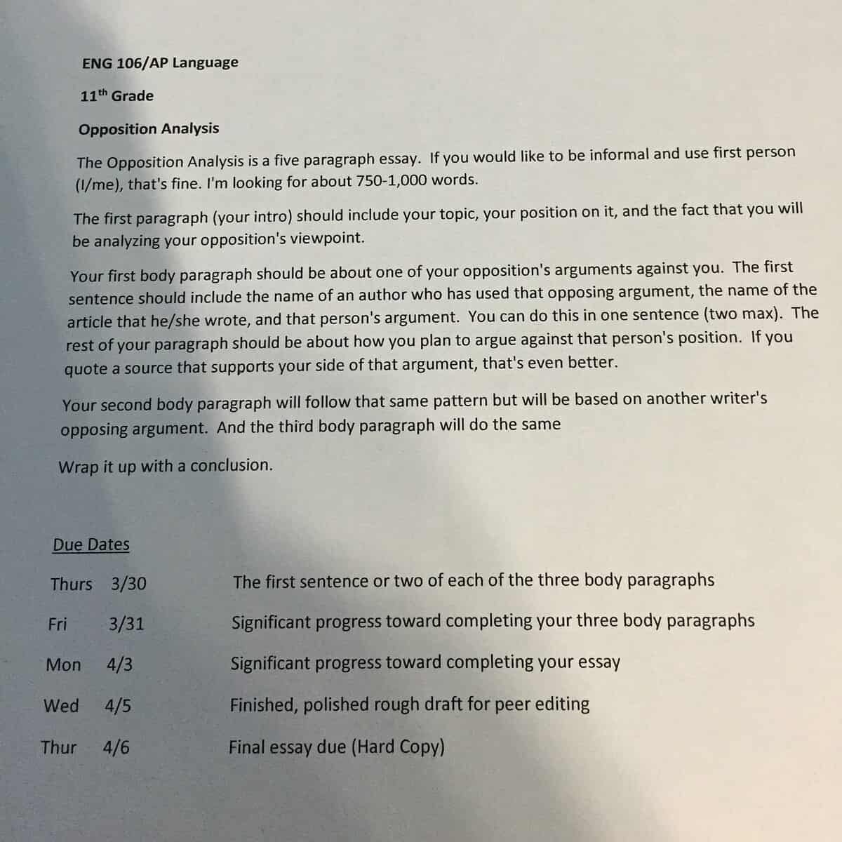 First paragraph- Your intro (including your topic), your position on it, and the fact that you’ll be analyzing your opposition’s viewpoint.