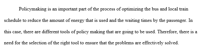 Chapter 7 presents a comparative analysis of various tools useful in policy making. Select two tools described in chapter 7 from different categories and describe how these tools could be used to develop policy for optimizing bus and local train schedules to minimize energy use and passenger wait times in a Smart City environment.