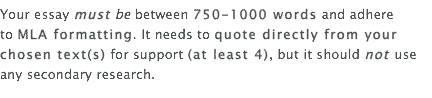 Your essay must be between 750-1000 words and adhere to MLA formatting. It needs to quote directly from your chosen text(s) for support (at least 4), but it should not use any secondary research.