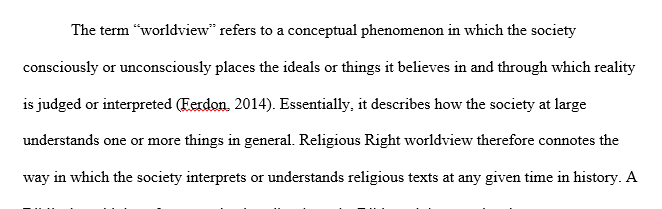 Question Prompt After reviewing the reading and study material on the Emergence of the Religious Right, you will gain a clearer understanding of the World View underlying the movement. Compare/Contrast the Worldview of the Religious Right, at the time of its founding, to your current Worldview.