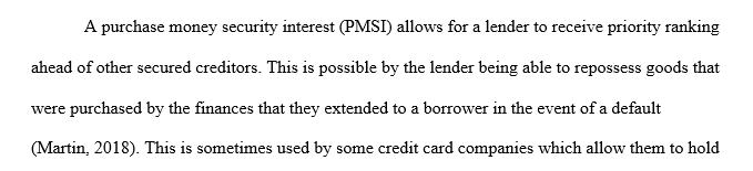 Discussion Question 2: Explain the concept of “Purchase Money Security Interest.” Discuss specifically a PMSI in “Inventory” and a PMSI in “Other Collateral,” and when each type of PMSI may take priority over a previously perfected security interest. Give an example of each.