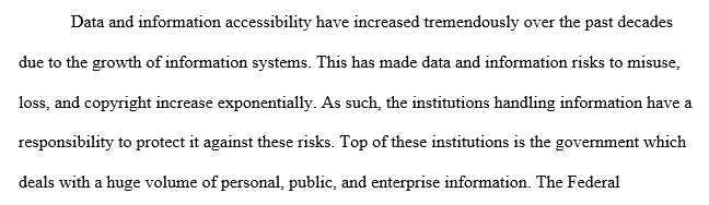 The Federal Information Security Management Act (FISMA) provides many standards and guidance for implementing effective security management programs. In a seven page paper describe the main elements of FISMA in the management and governance offered for information Systems