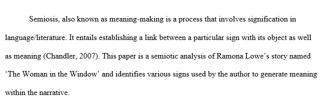 For this assignment, you will write a short essay in which you take a semiotic approach to “The Woman in the Window,” a short story by Ramona Lowe, originally published in 1940. The objective of this assignment is for you to choose, and apply, knowledge drawn from our course so far to show how semiosis (meaning-making) takes place in Lowe’s short story. Your goal is not to say what you think Lowe’s story means in the usual sense of reading a work of fiction. Whether you think the story is good or bad, whether or you liked it or not, or how you felt during or after reading it, are irrelevant to this assignment. Rather, your goal is look at Lowe’s story as a container of multiple signs that produce meaning within the story.
