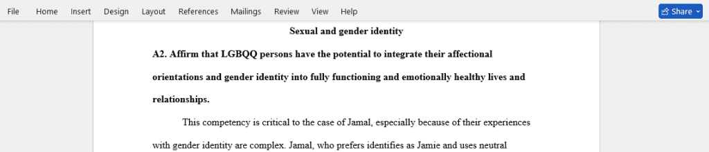 As encouraged by the American Psychological Association (APA), counselors would do well to take into consideration the individual\’s worldview, life experiences, and support system as they assist the individual through personal exploration. For this reason, this assignment asks you to review the case study below and reflect on the American Counseling Association (ACA) approved competencies listed here in the document entitled: ALGBTIC Competencies for Counseling Transgender ClientsLinks to an external site.