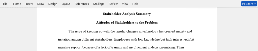 In addition to the completed “Stakeholder Analysis” Excel spreadsheet, submit a 500-word summary of your findings, which may be accomplished through one- or two-sentence summary responses to the following points: