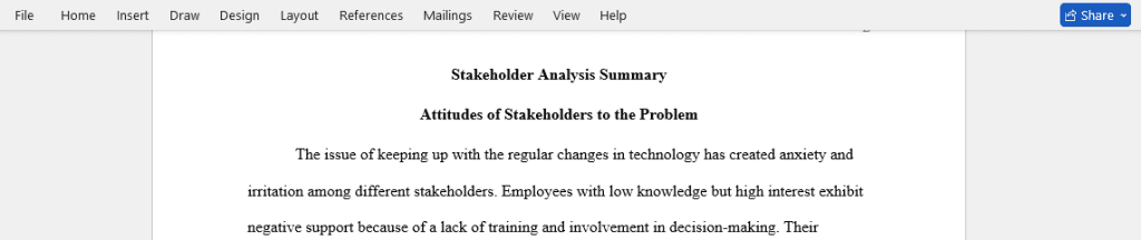 In the analysis, list titles and groups of stakeholders. Do not list names of specific individuals. It is important to note the role each stakeholder has in the problem and in solving the problem. Determine whether or not the individual or group has a negative, indifferent, positive, or very positive predisposition about the problem.