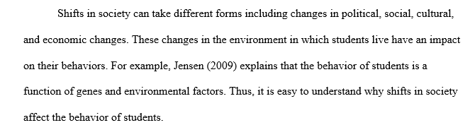 1. Even though they are beyond the school’s control, shifts in society can influence student behavior in school. What shifts in society during the past 10 years do you believe have had influences that are negative on behaviors in the classroom?